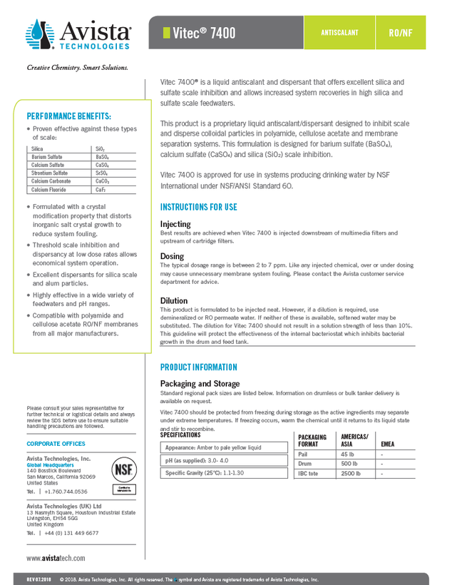 آنتی اسکالانت Avista Vitec 7400 برای آب های با سختی بالا و حاوی سیلیس